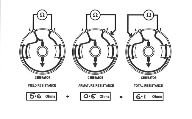 Placing the leads on a good ground point and the F terminal effectively measures the field plus armature circuits in series (from the F terminal, through the field windings, then through the armature to ground).