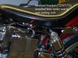 There was a terminal bracket (72307-71) attached around the factory key switch location and a 3 wire harness to extend the key switch up to the motor mount between the cylinders.