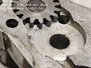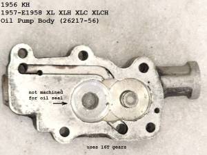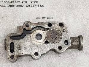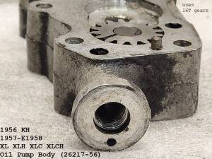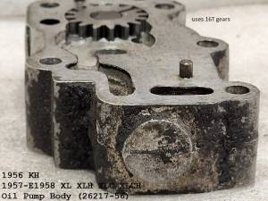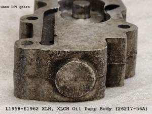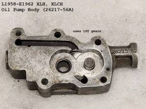 Pump body (26217-56A) was used from L1958-E1962. It is the same as 56KH to E58 XL body but machined for the seal between the feed and return gears.