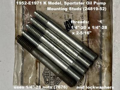 1952-E1971 production Model K and Sportster pumps used 1/4”-20 x 1/4“-28 x 2-5/16” studs with lockwashers and nuts.