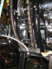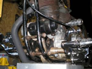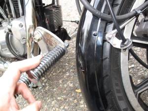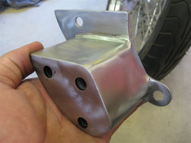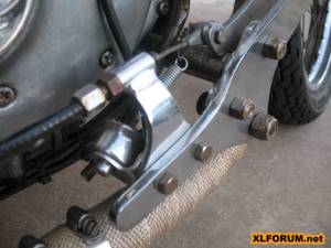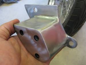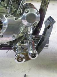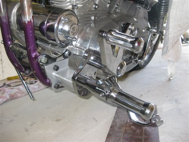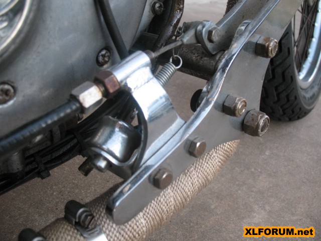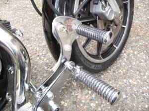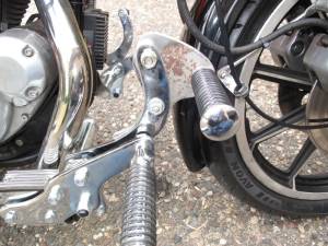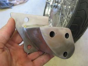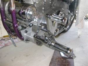 | A pattern was cut out of a 1/4“ plate. Once installed, it moves the peg forward so you don't have to lift your leg off foot peg to hit the brake. Tools used: sawzall, die grinders, bench grinders, and files to cut and shape the plate. |