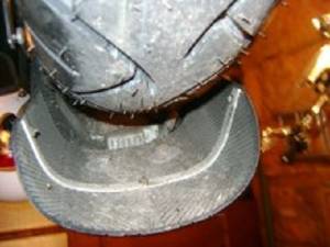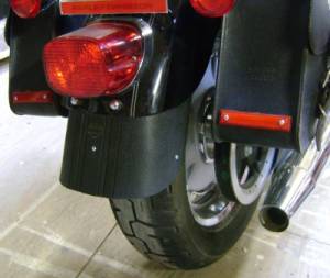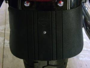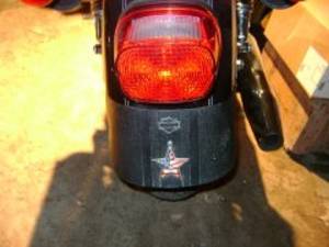 The flap is a synthetic rubber as sold as a mud-flap for trucks. The bike uses about 1/2 of one truck flap. As a synthetic, it is much easier to carve than rubber, and will last longer than leather. Best tool to use, if an inexperienced carver, is a V-tool, a carving tool for wood, rather than a detail blade. Xerox a downsized logo, attach to flap with rubber cement (removes easily), and cut along the lines of the picture, through the copy and into the rubber. Keep your other hand out of the way in case you slip. It makes for one hell of a cut in your hand if you lose control. Wiggle it along instead of forcing it.