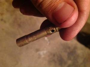On the side of this jet there will be 2 holes, one over the other. These are cross drilled at 90° apart, making a total of 8 holes in the side of the jet.