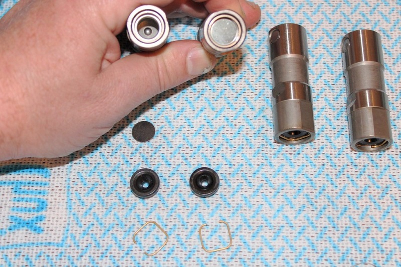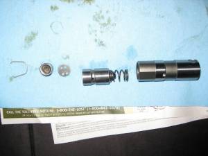 From left to right you can see the retaining clip, pushrod seat, piddle valve, plunger / spring, and lifter body.