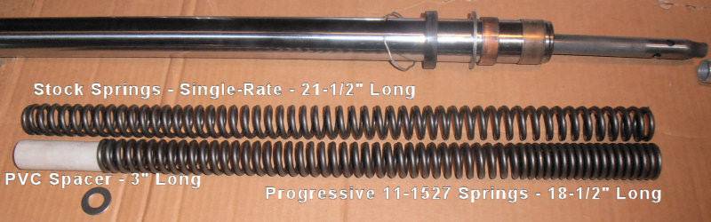 At the same time, I replaced my stock fork springs with the Progressive 11-1527 springs. This spring kit is designated for rubbermount models, but the spring specs match for 88-later models with 39mm tubes. But the spacer needed to be shortened.