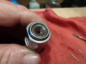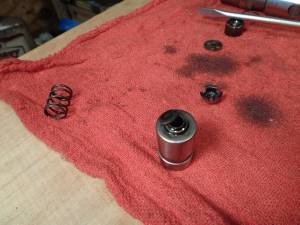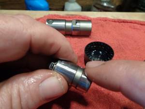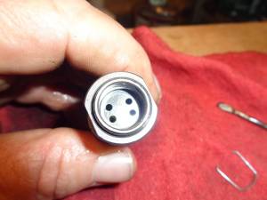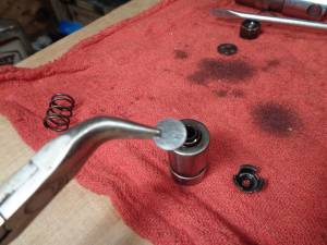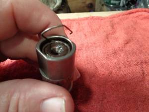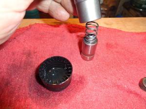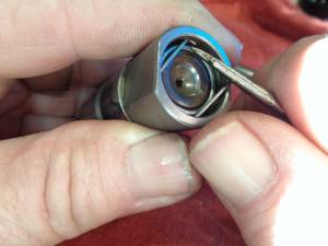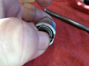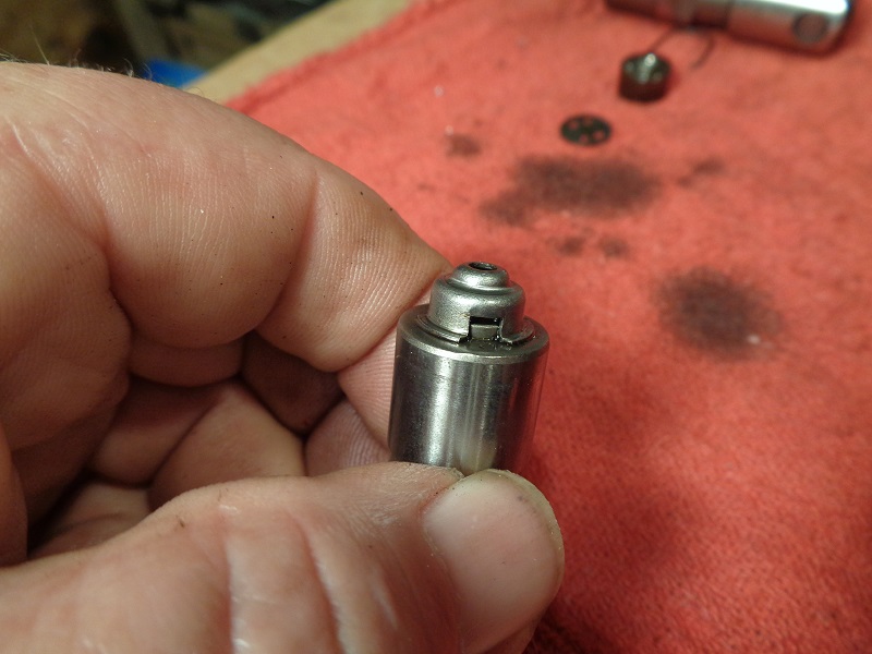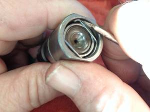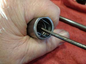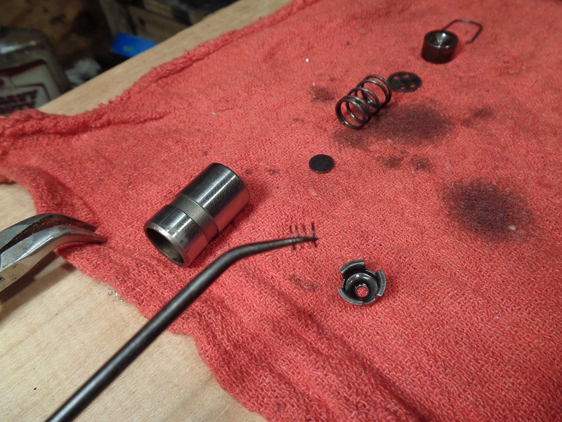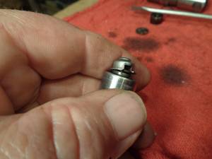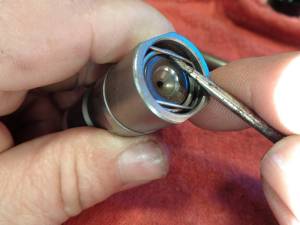 A doglegged pick works good for removing the retainer clip and removing the internals. 1) | This is not a good idea as the clip may fly off once removed and you can lose it. 2) | Push slightly on the plunger to remove pressure on the clip and use the pic to pull the clip away from the groove in the top. 3) |