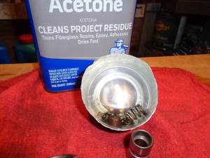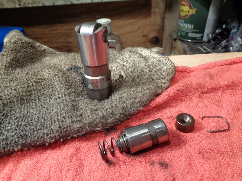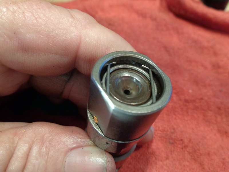 Now you can remove the clip. You can dump the lifter into a rag to keep from losing parts and the guts may fall out when turned upside down. Notice the springs natural positioning of the top of the cup. 4) |