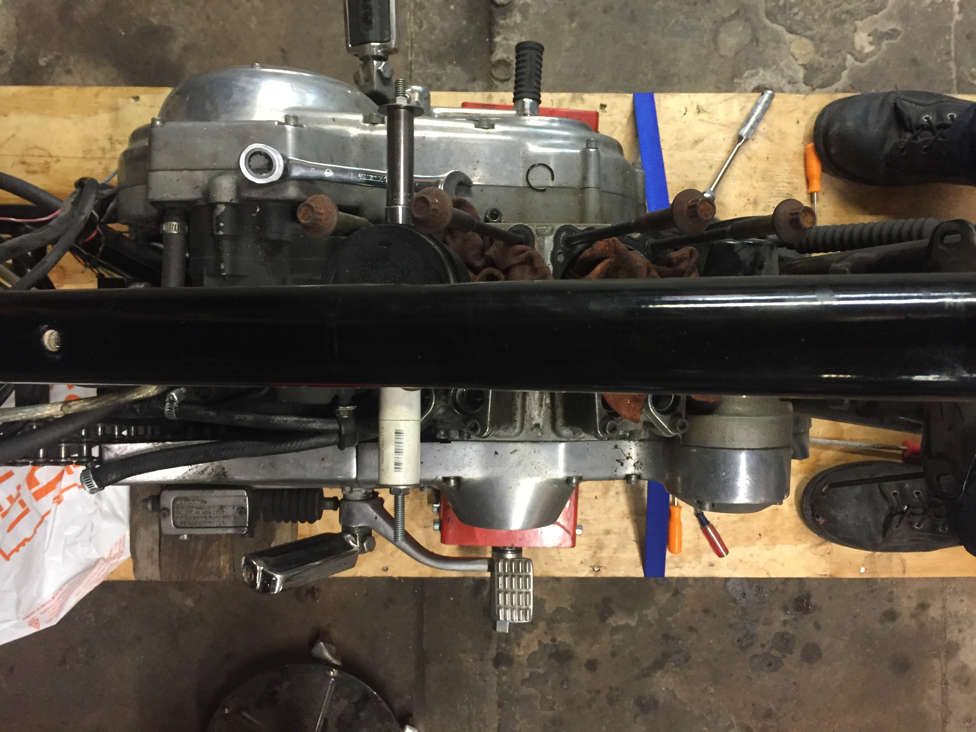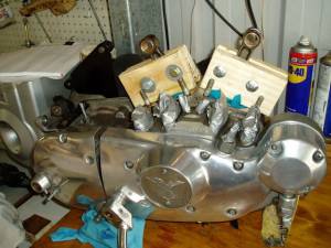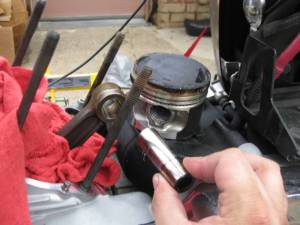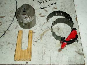 A wooden spacer with slot to hold piston steady as you slide the cylinders on. Also, a Volkswagen “krinkle cut” ring compressor that comes