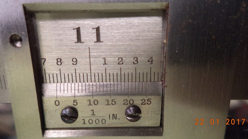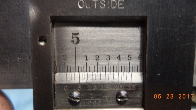 - Reading Verniers: In the left pic below, a measurement was taken at 10.770”. Read the numbers on the slide rule and add the numbers in the window (which on this model amounts to one thousandth each). As you can see, your watching for the number that matches up with the correct line between the window and the slide rule. The sum of 2 initial readings taken reveals the final reading on this type of caliper. Check the gradients before using to verify (IE metric vs U.S.). In the left pic below, 10.50“ is the closest accurate reading on the slide rule and 0.020” from the window equals 10.770“. Verniers can be used for inside or outside measurements. Outside measurements are taken between the jaws and inside measurements are taken from the outside edge of each jaw. The slide rule gradients are different on each side to accurately show the readings for each choice measurement taken. Notice above the right pic below showing the words 'outside'. The opposite side is marked 'inside'.