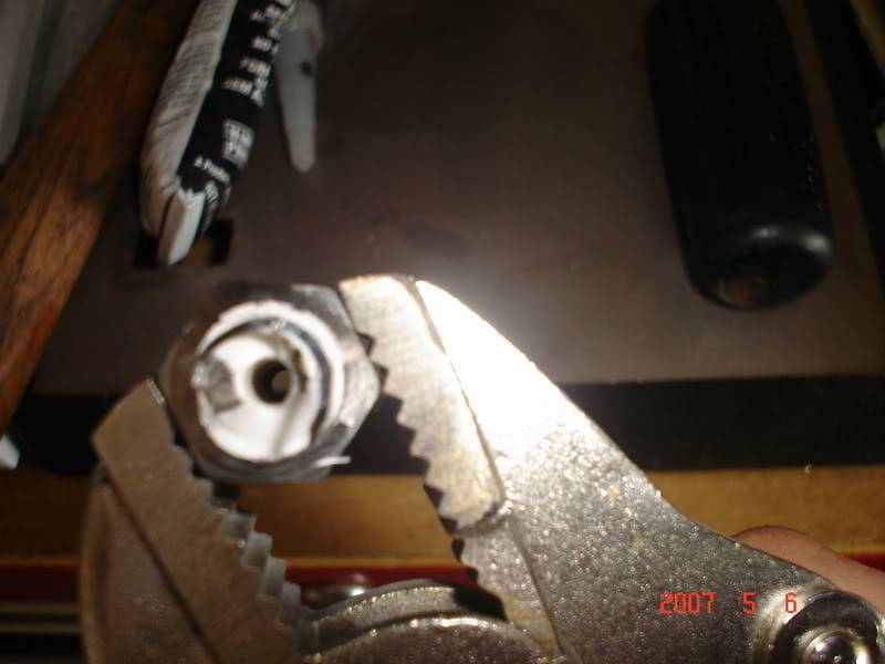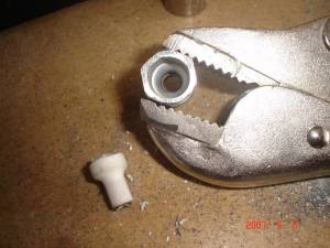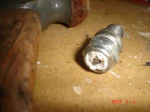 Break the porcelain off with a hammer (eye protection required). Take a small screwdriver and break up the porcelain under the crimp (portion that holds the porcelain in the plug body ), this will let you grind the crimp only and the job will go faster as the porcelain is harder to grind. Then pull the rest of it out. You now have to tap threads in the gutted area for 1/4“ NPT (national pipe thread)in the plug body and you are ready to go. 11) |